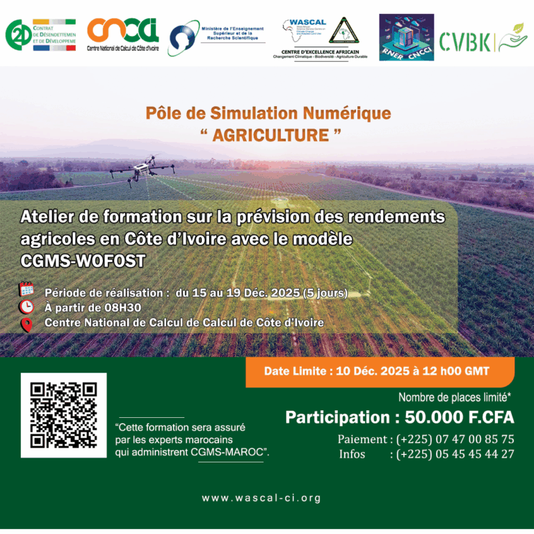 Appel à candidatures Le Pôle de Simulation Numérique “Agriculture” annonce l’ouverture des inscriptions pour l’atelier de formation sur la prévision des rendements agricoles en Côte d’Ivoire avec le modèle CGMS-WOFOST.
